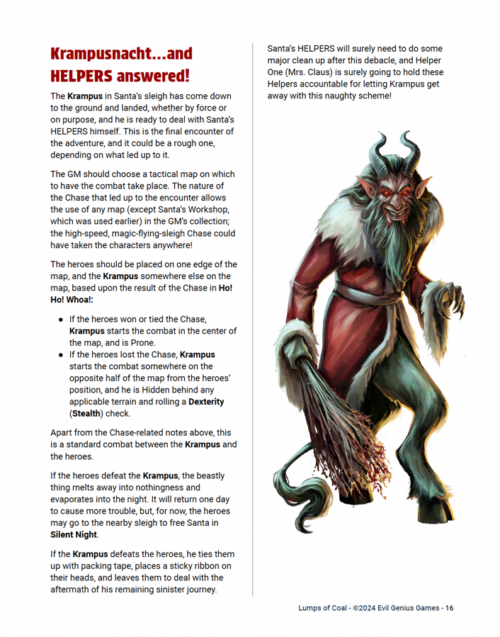 Lumps Of Coal is a wild adventure for a team of Santa’s Little Helpers, the elite team of misfits who defend the North Pole against Krampus and his Naughty Listers. Mrs. Claus has put out the call! The workshop is under attack and Santa is missing. Grab your candy cane launcher and put on your holiday best because it’s time to save Christmas! Also included are two great holiday maps, 10 holiday themed tokens, and six pre-generated HELPERS ready for action!